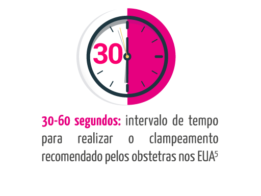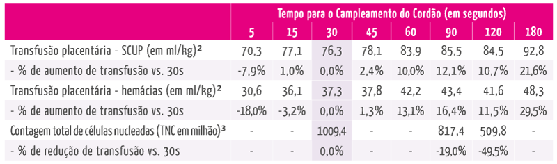 Em resumo, foi demonstrado que em partos a termo de gestantes saudáveis, o clampeamento do cordão entre 30 e 60 segundos é seguro para o bebê e permite uma coleta adequada de sangue do cordão umbilical e placentário (SCUP),¹ conforme os dados abaixo: