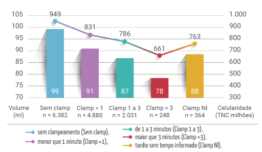 Foram analisados os dados de volume (ml) de sangue de cordão coletado e de celularidade (TNC – células nucleadas totais) dos 13.881 nascimentos com coleta do sangue do cordão, divididos em cinco categorias de clampeamento: